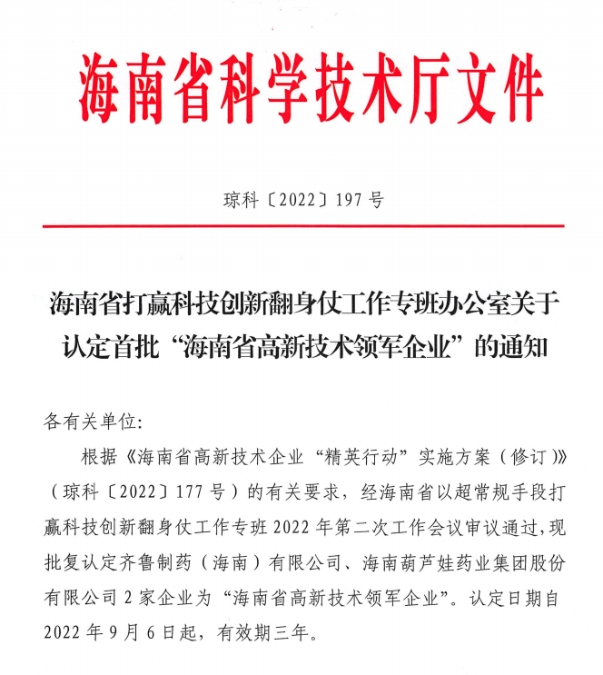 近日,海南省科学技术厅发布的《海南省打赢科技创新翻身仗工作专班办公室关于认定首批“海南省高新技术领军企业”的通知》中显示,批复认定海南人生就是博尊龙药业集团股份有限公司等2家企业为“海南省高新技术领军企业”。认定日期自2022年9月6日起,有效期三年。