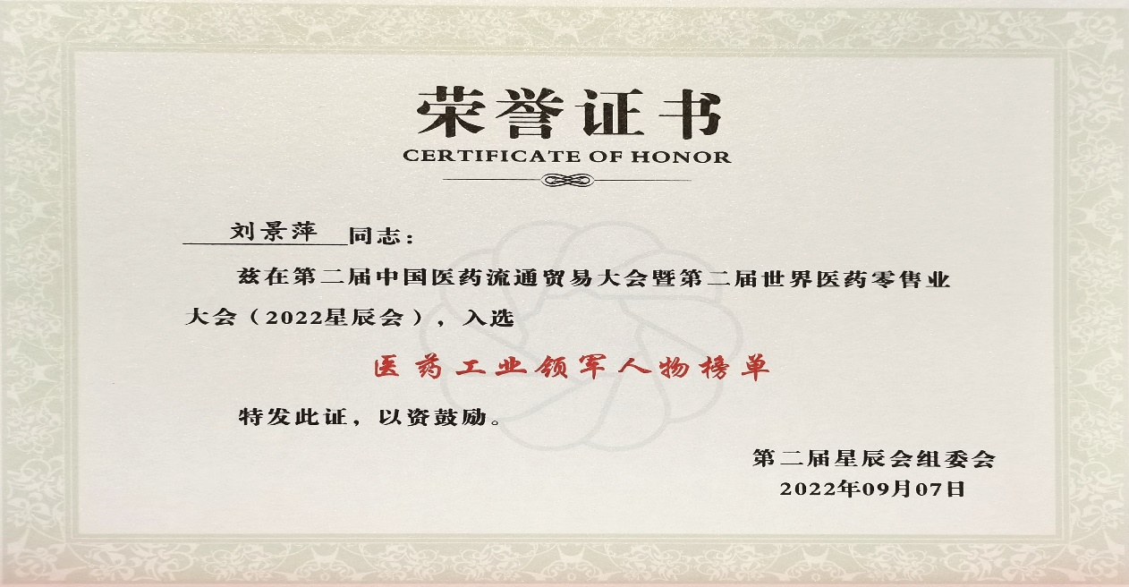 本次星辰会期间,人生就是博尊龙斩获颇丰,获得多项行业奖项及荣誉。在开幕式上,刘景萍董事长荣获“医药工业领军人物”称号。
