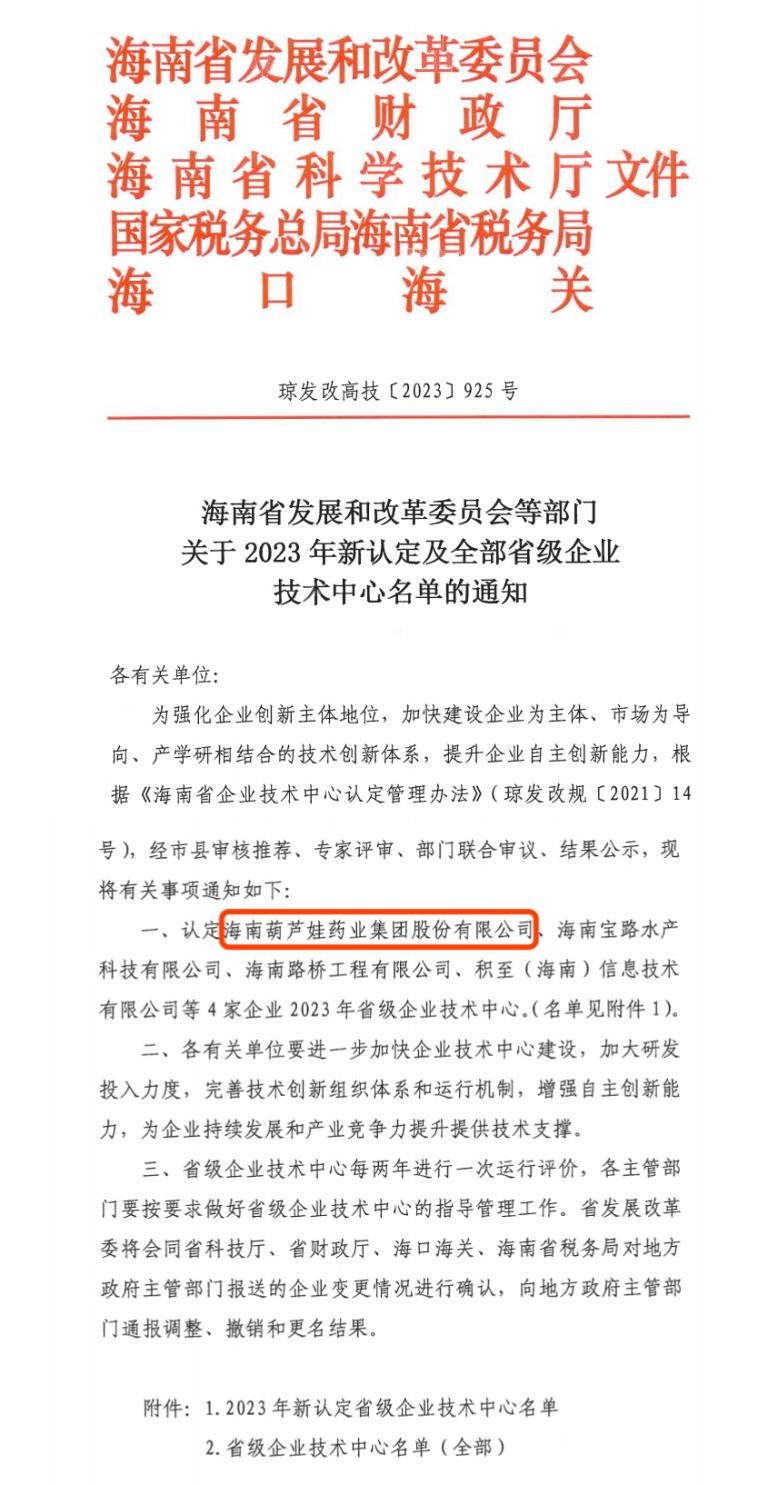 近日,海南省发改委等多部门联合公布了《关于2023年新认定及全部省级企业技术中心名单的通知》,其中,海南人生就是博尊龙药业集团股份有限公司成功通过评审,被认定为省级企业技术中心,是本次获批的4家企业之一。
